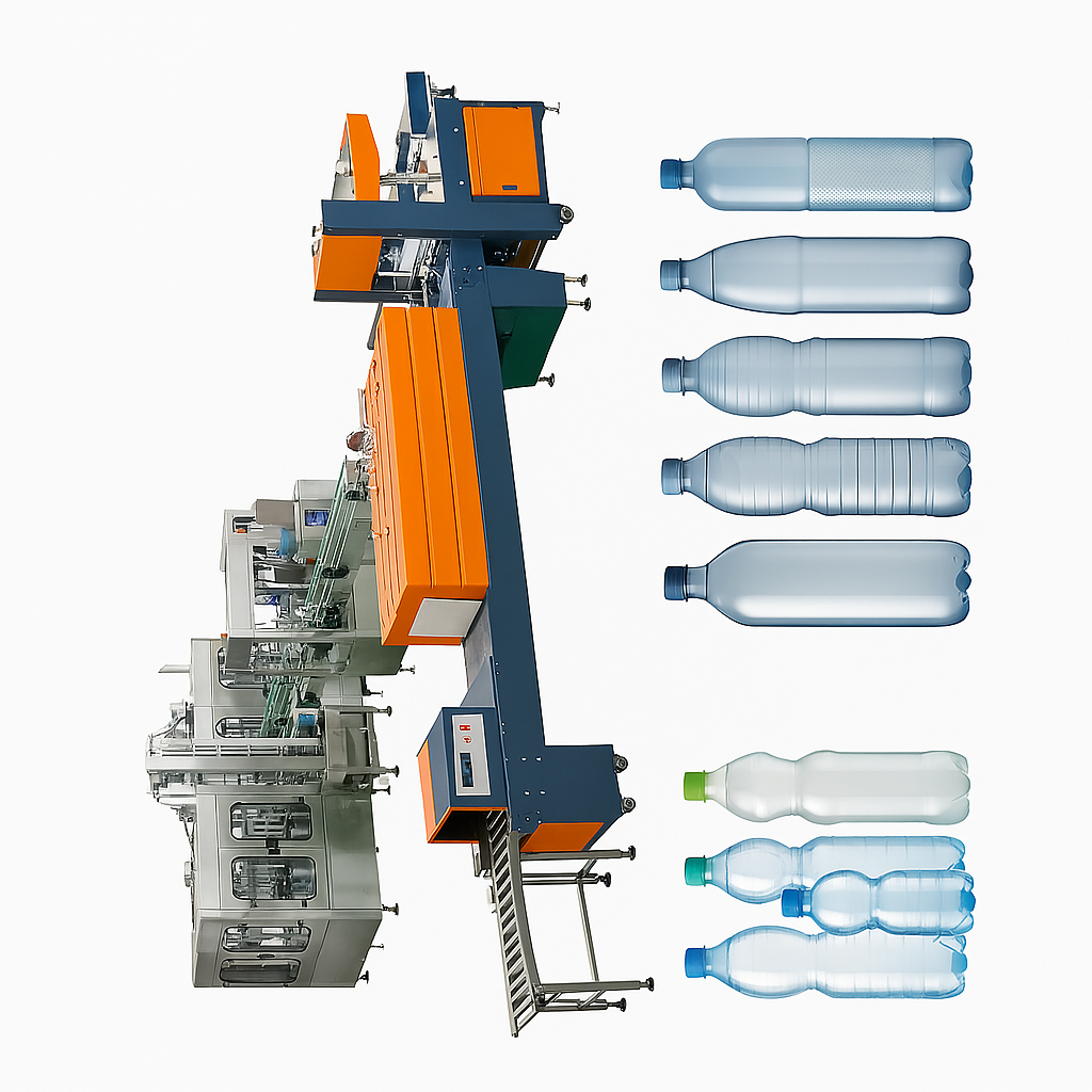 This bottling and shrink wrapping production line ensures efficient, hygienic packaging for high-volume beverage manufacturing operations.